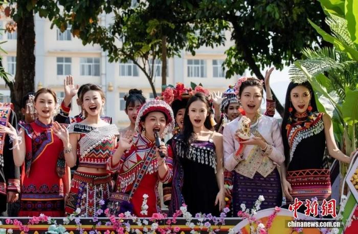 2026年2月19日,地处中缅边境的云南省普洱市澜沧拉祜族自治县迎来拜年习俗活动,该县各乡镇各民族代表组成的拜年团,身着盛装,载歌载舞进行巡游拜年活动。图为身着盛装的拜年团成员向游客问好送祝福。张子晗 摄
