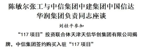座谈后,由中信集团、中建集团、中国信达和天津市出资成立的“117项目”投资联合体天津天信华创集团有限公司揭牌。天津天信华开有限公司与中信集团在前期达成认购意向的基础上签署“117项目”主塔楼部分楼层买卖协议,与中信银行、中信证券、中信保诚人寿签署下属机构入驻协议。