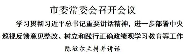 3月30日,市委常委会召开会议,合并召开市委推进中央巡视反馈意见整改工作领导小组会议、市委党的建设工作领导小组会议,学习贯彻3月27日中央政治局会议精神,听取中央巡视反馈意见整改工作进展、我市树立和践行正确政绩观学习教育开展情况汇报,审议市委、市人大常委会、市政府、市政协领导班子及主要负责同志学习教育查摆问题清单,研究部署有关工作。市委书记陈敏尔主持会议并讲话。