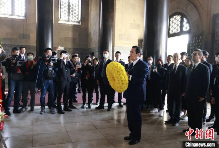 2023年3月28日,中国国民党前主席马英九一行拜谒南京中山陵。图为马英九向孙中山先生石刻坐像敬献花环。路梅 摄