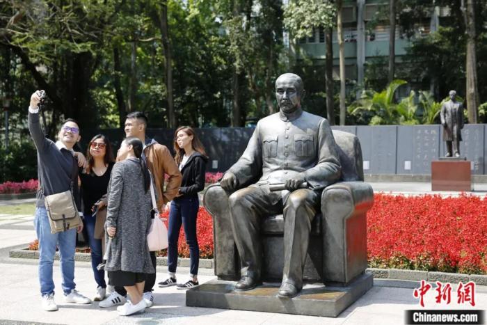 游客在台北与孙中山雕像合影。陈小愿 摄