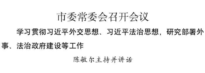 4月22日,市委常委会召开会议,合并召开市委外事工作委员会会议,学习贯彻习近平外交思想、习近平法治思想,传达学习党中央对外事工作部署要求,听取市委外事工作委员会2025年工作情况、2026年工作要点和2025年法治政府建设情况汇报,审议市委外事工作委员会工作规则(修订稿)及其办公室工作细则(修订稿)和天津市人民政府2026年度立法计划,研究部署有关工作。市委书记陈敏尔主持会议并讲话。