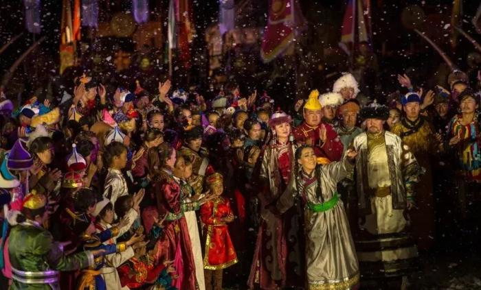 ▲实景剧《东归·印象》中展现蒙古族土尔扈特部东归抵达巴音布鲁克草原的场景。江文耀摄。(图片来源:中国民族报)