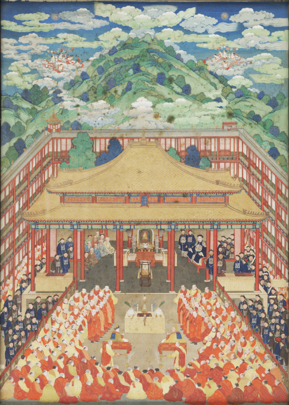▲清代《万法归一图》屏。图绘在明净开阔的大殿内,乾隆皇帝身着朝服正襟危坐,他对面是包括年轻的渥巴锡在内的十位土尔扈特部首领。(图片来源:故宫博物院)