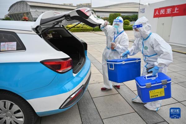 3月24日,在福建泉州市海峡体育中心联合方舱核酸检测基地,参加“抗疫志愿车队”的出租车司机(左)协助医务人员装运核酸检测样本。