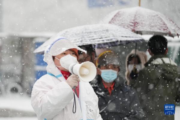 3月18日,在北京市东城区北新桥街道一处核酸采样点,工作人员冒雪引导前来检测的居民。