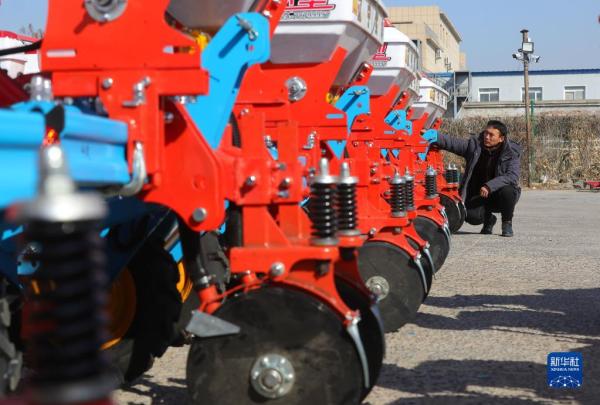 2月23日,在辽宁省铁岭县辽宁实丰机械有限公司,工人检查即将出厂的玉米播种机。
