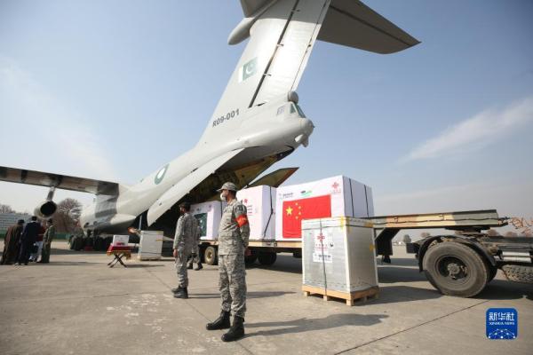 这是2021年2月1日在巴基斯坦首都伊斯兰堡附近的努尔汗空军基地拍摄的中国政府援助新冠疫苗交接仪式现场。