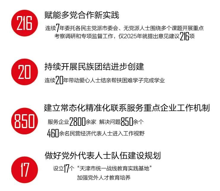 赋能多党合作新实践,中国新型政党制度优势充分发挥。制定《中国共产党政治协商工作条例》落实举措,每年印发政党协商计划,召开党外人士座谈会、协商会、通报会。市委连续7年委托各民主党派市委会、无党派人士围绕“大城细管、大城智管、大城众管”、“助力天开高教科创园建设”等多个课题开展重点考察调研和专项监督工作,仅2025年就提出意见建议216项。发挥“直报制度”、“对口联系制度”作用,推动各民主党派市委会与市政府相关部门建立对口联系。引导各民主党派落实参政党建设政策文件精神,聚焦“四新”、“三好”要求,持续强化自身建设。