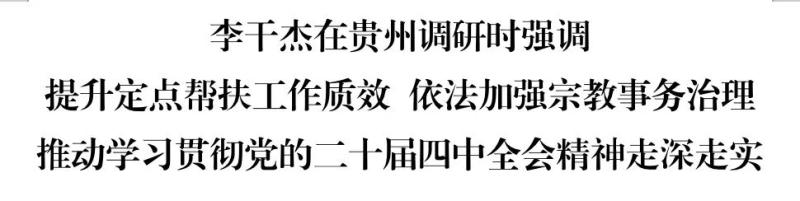 11月16日至18日,中共中央政治局委员、中央统战部部长李干杰在贵州调研时强调,要以习近平新时代中国特色社会主义思想为指导,深入学习贯彻党的二十届四中全会精神,着力提升统一战线定点帮扶工作质效,坚持我国宗教中国化方向、加强宗教事务治理法治化,为实现“十五五”规划凝心聚力,以实际行动坚定拥护“两个确立”、坚决做到“两个维护”。