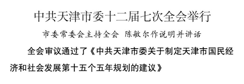 全会由市委常委会主持。市委书记陈敏尔作了讲话。全会审议通过了《中共天津市委关于制定天津市国民经济和社会发展第十五个五年规划的建议》。陈敏尔就《建议(讨论稿)》向全会作了说明。