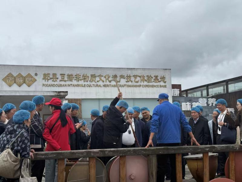 在川味非遗瑰宝与工业旅游典范——郫县豆瓣非遗传承企业,学员们参观企业展厅、豆瓣生产基地,了解郫县豆瓣传统工艺、现代生产与工业旅游的有机融合,体悟中国顶尖调味料在选材与工艺上的独树一帜。同时,围绕产品推广、技术研发等内容开展座谈交流。岳川酱坊主要负责同志结合自身发展现状与其进行深入交流,为下一步提质增效、产品研发开拓了新思路。