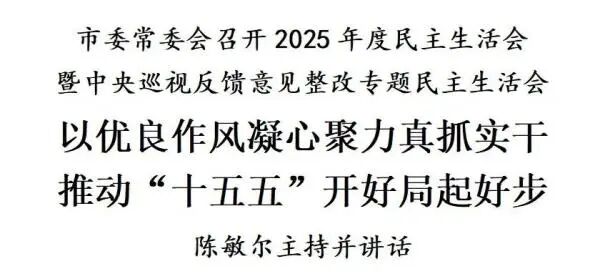 1月17日,按照党中央部署要求,市委常委会用一整天时间召开2025年度民主生活会暨中央巡视反馈意见整改专题民主生活会。这次民主生活会以中央政治局民主生活会为标杆,深入学习贯彻习近平新时代中国特色社会主义思想,全面贯彻落实党的二十大和二十届历次全会精神,围绕锲而不舍落实中央八项规定精神、推进作风建设常态化长效化,对照中央巡视反馈意见,结合周德睿严重违纪违法案件,联系思想和工作实际,进行自我检视、党性分析,开展批评和自我批评。