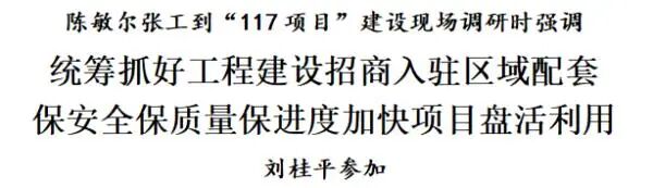 陈敏尔、张工指出,“117项目”自去年4月复工建设以来,各方面做了大量深入细致的工作,顺利实现新旧交割,全面建设有序推进,投资联合体成功组建,招商引资有力有效,区域配套同步实施,盘活利用工作取得重要阶段性进展。成绩来之不易,后续任务依然繁重。要知重负重、知难克难、知责担责,再接再厉、全面协调推动各项工作,统筹推进“117项目”及周边片区存量资源资产盘活,努力实现以区域发展助力项目盘活、以项目盘活带动区域发展,为高质量发展注入新动能。扎实推进工程建设,坚持安全第一、质量至上、进度为要,加强组织调度,坚持统分结合,强化现场管理,守牢安全底线,严格遵守财经纪律,着力打造精品工程、安全工程、廉洁工程。提高招商入驻质效,统筹好当前和长远、项目和区域,加强总体谋划,做好宣传推介,强化政策供给,突出产业链招商、以商招商,引入更多有科技含量、就业容量、环境质量、税源增量的项目,导入更多新产业、新业态、新模式,因地制宜发展新质生产力。完善区域功能配套,立足区域实际、着眼发展需求、坚持必要且可行,统筹推进基础设施建设、交通路网提升、教育和医疗等公共服务提质、市容环境改善等工作,持续优化生产、生活、生态空间布局,营造近悦远来的良好氛围。