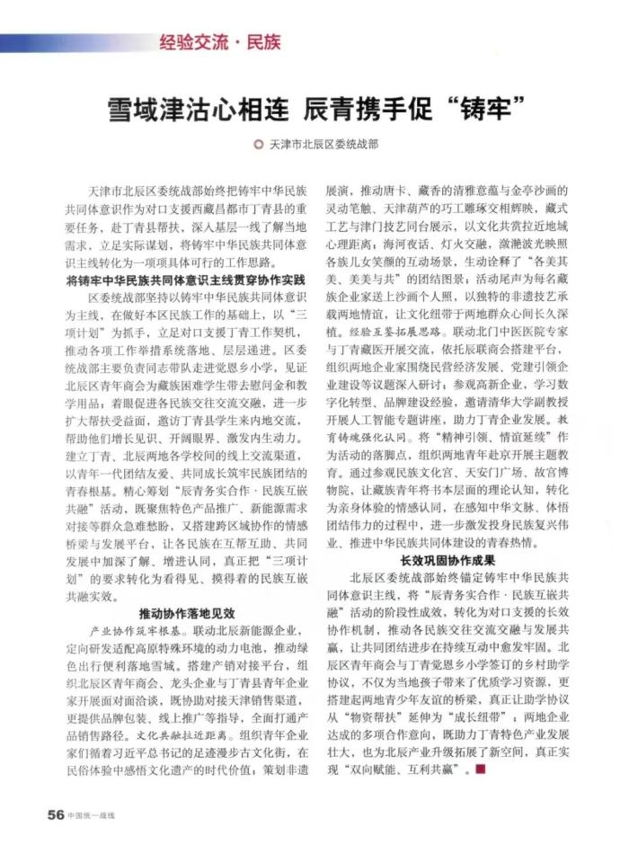 天津市北辰区委统战部始终把铸牢中华民族共同体意识作为对口支援西藏昌都市丁青县的重要任务,赴丁青县帮扶,深入基层一线了解当地需求,立足实际谋划,将铸牢中华民族共同体意识主线转化为一项项具体可行的工作思路。